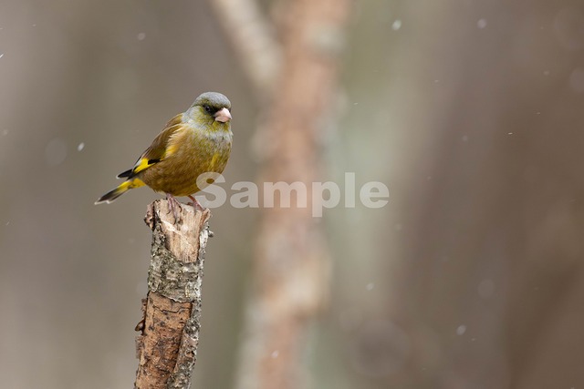 被写体:小雪の舞う森の枯れ枝に止まるオスのカワラヒワ 撮影日:2026年1月13日 撮影地:山梨県北杜市 サイズ:5000×3333ピクセル/47.7M 使用機材:Canon R6markⅡ + Canon EF500mm F4L IS USM+1.4xⅢ
