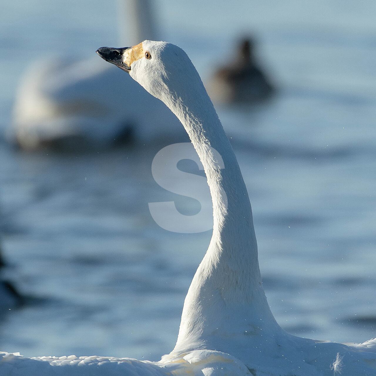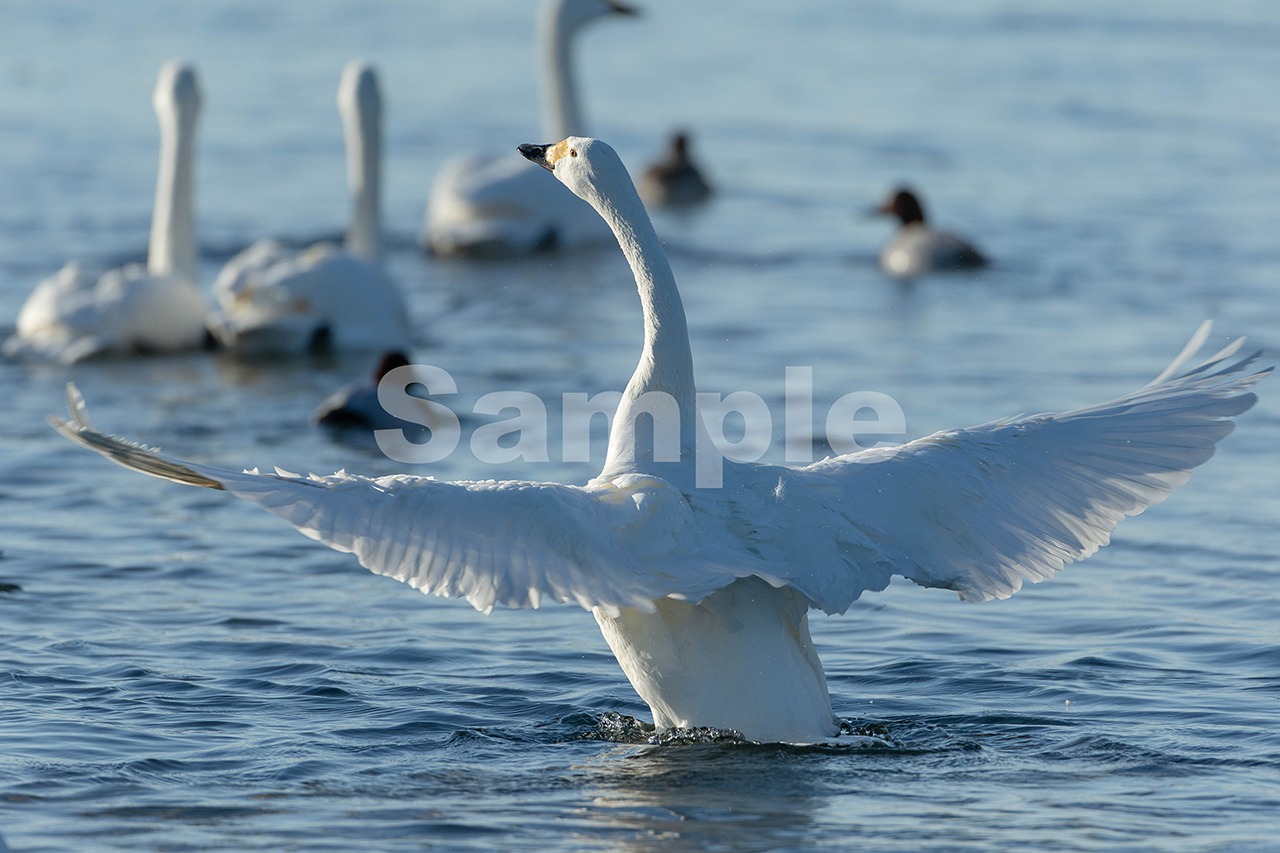 被写体:越冬地の河川で羽ばたくコハクチョウ