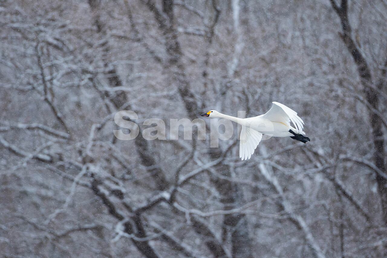被写体:雪の舞う朝の河原を飛翔するコハクチョウ