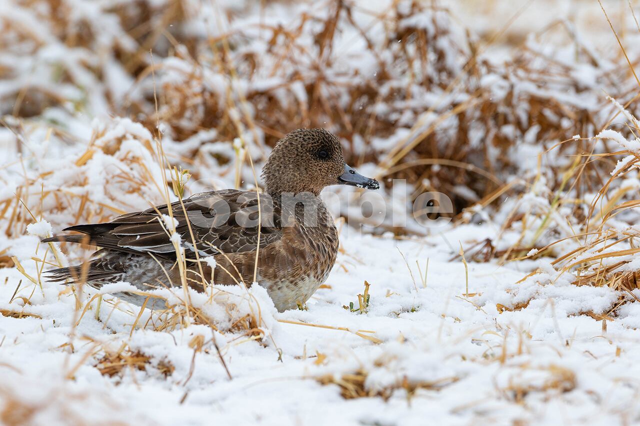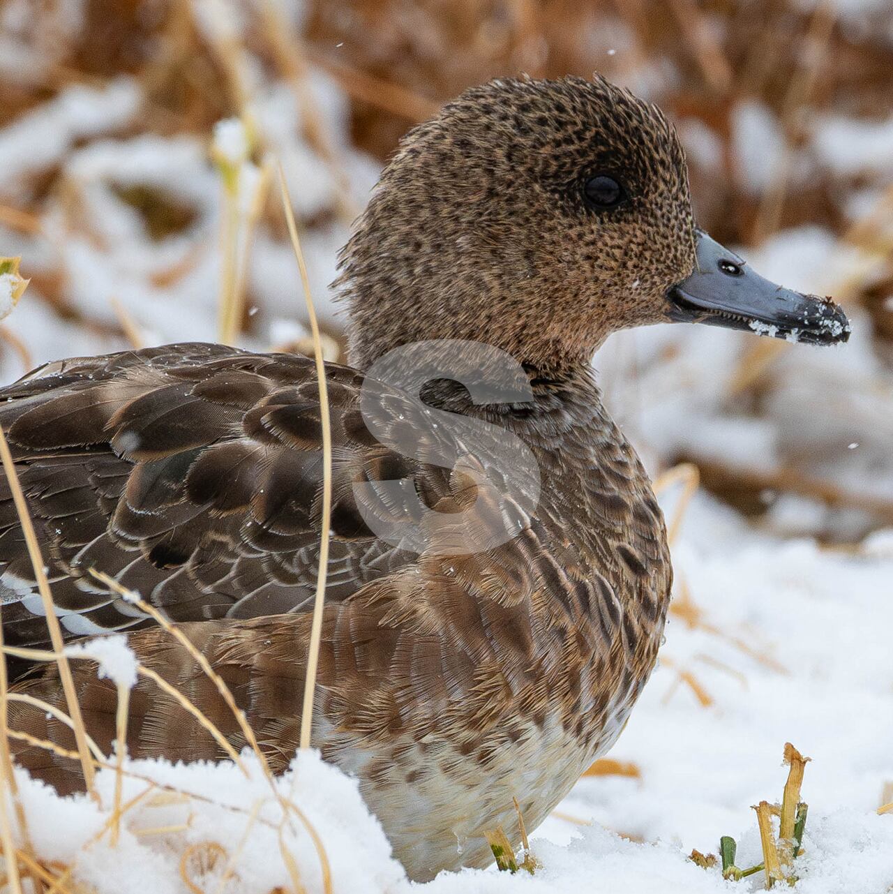 被写体:降雪後の池畔で採餌するヒドリガモのメス