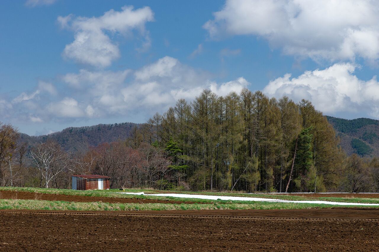 テーマ:芽吹き始めたカラマツ林を背景にした植え付けを待つ高原野菜畑