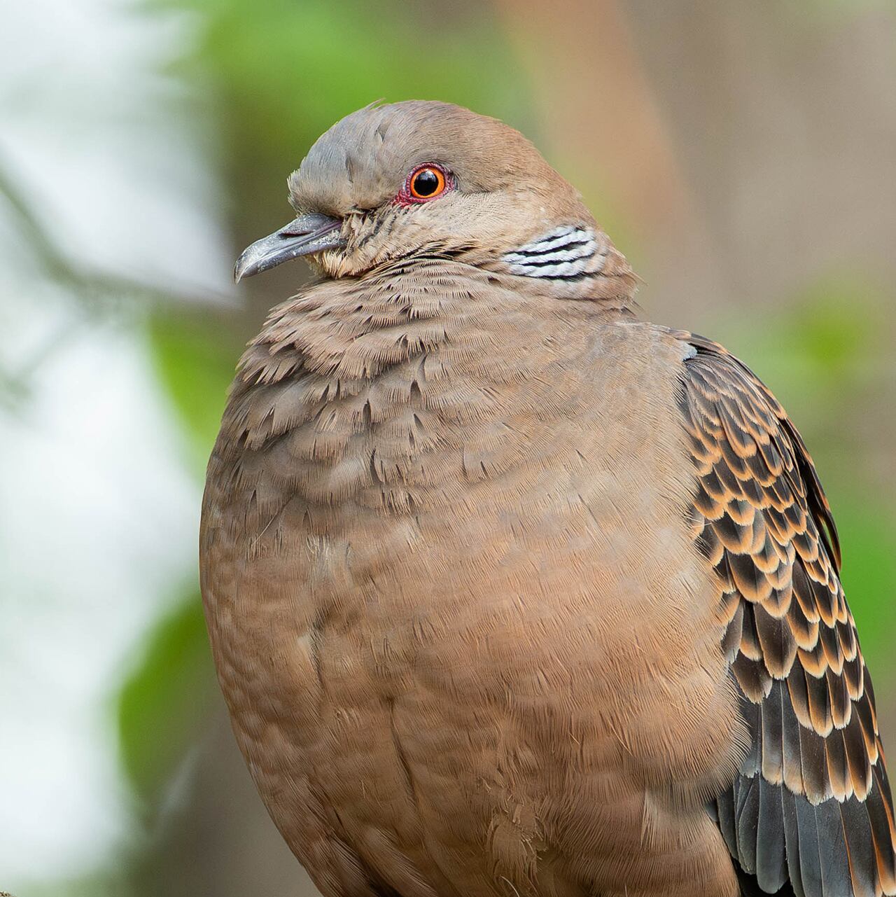 被写体:新緑の林を背景に枯れ枝に止まるキジバト