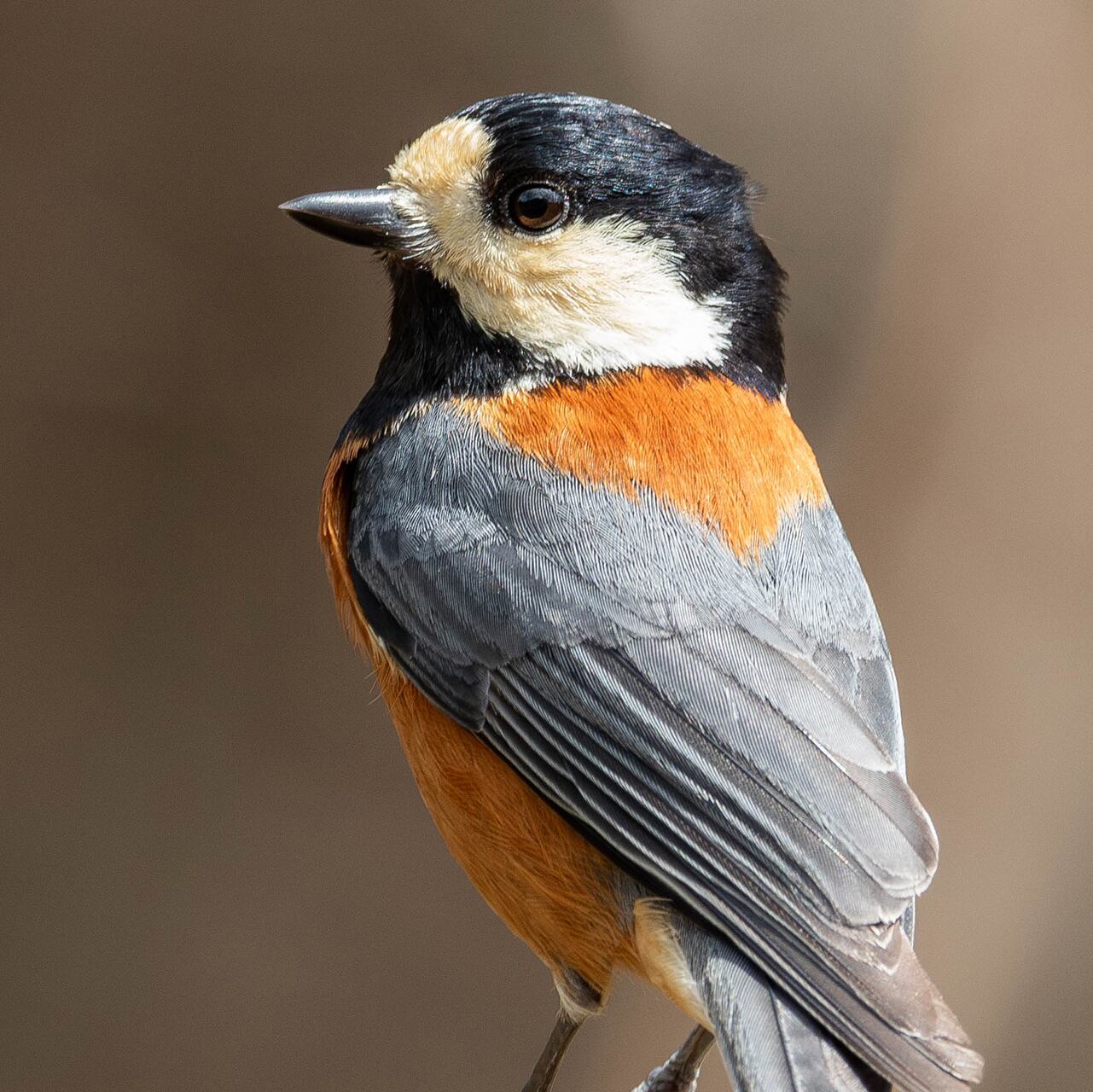被写体:高原の芽吹き前の林を背景に立ち枯れたカラマツの幹に止まるヤマガラ