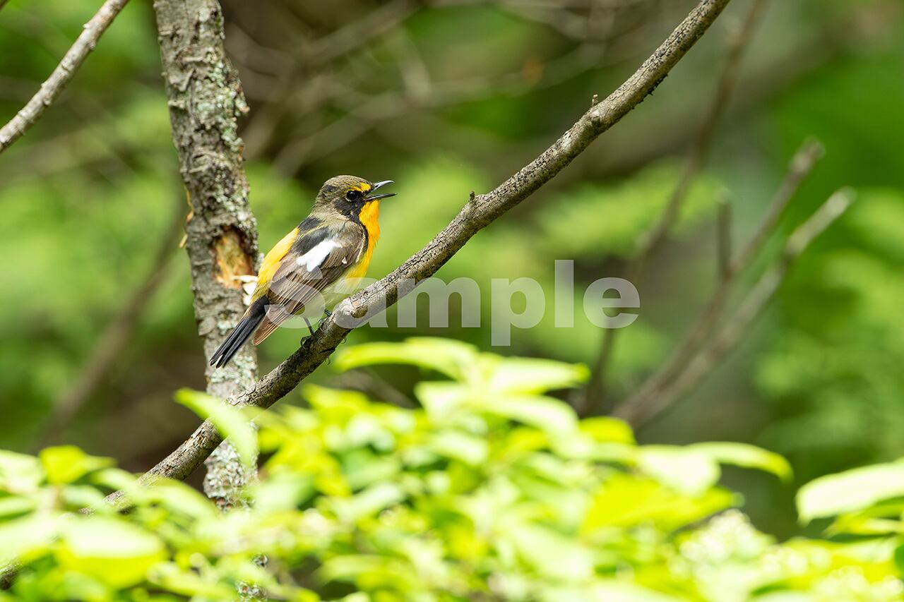 被写体:高原の谷間のテリトリーで囀るキビタキの若いオス