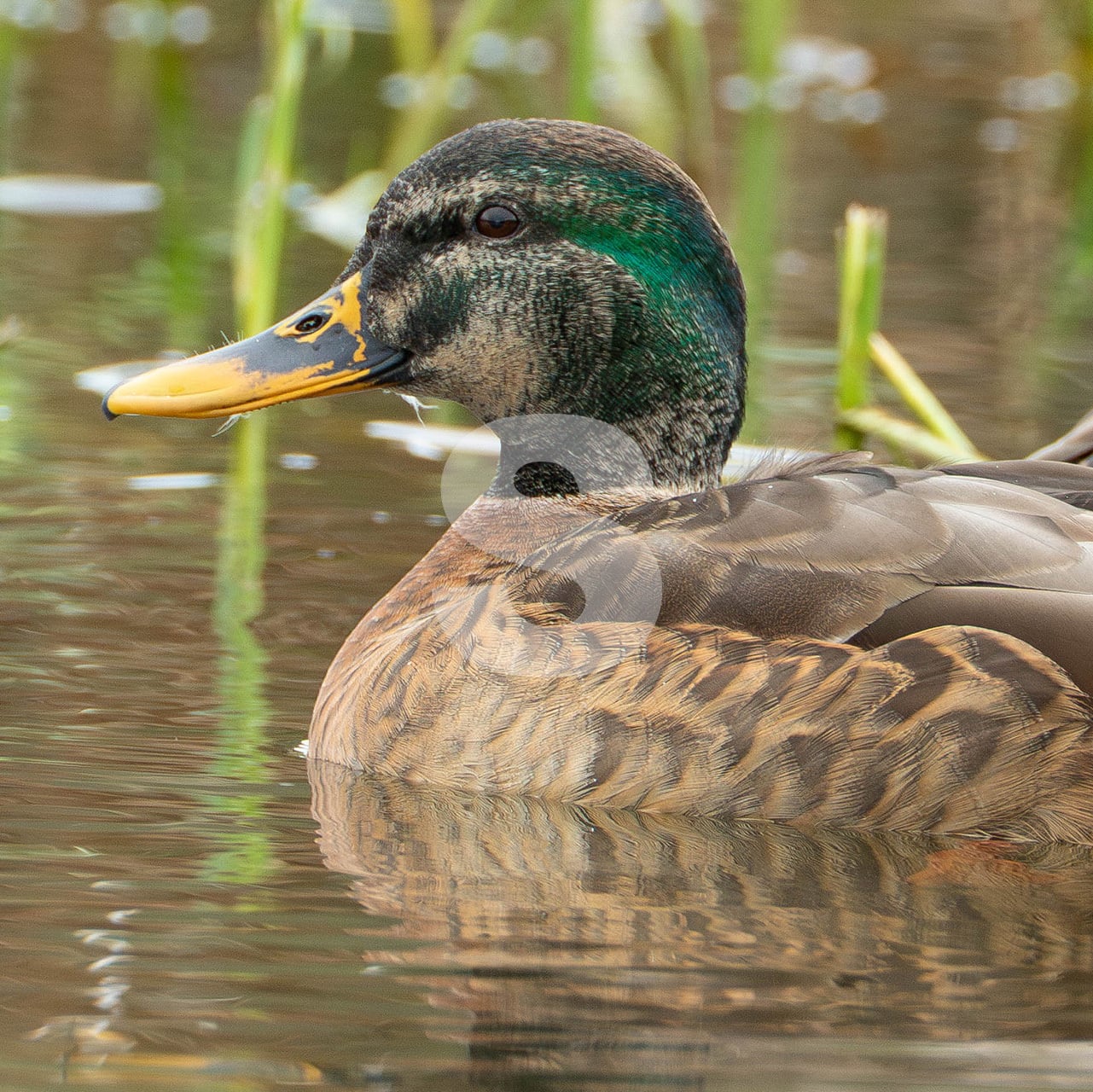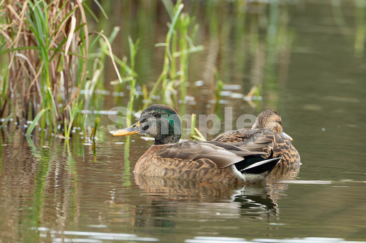 被写体:秋の遊水池を泳ぐエクリプスの終わりかけたマガモのオス