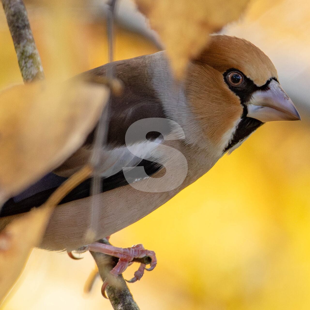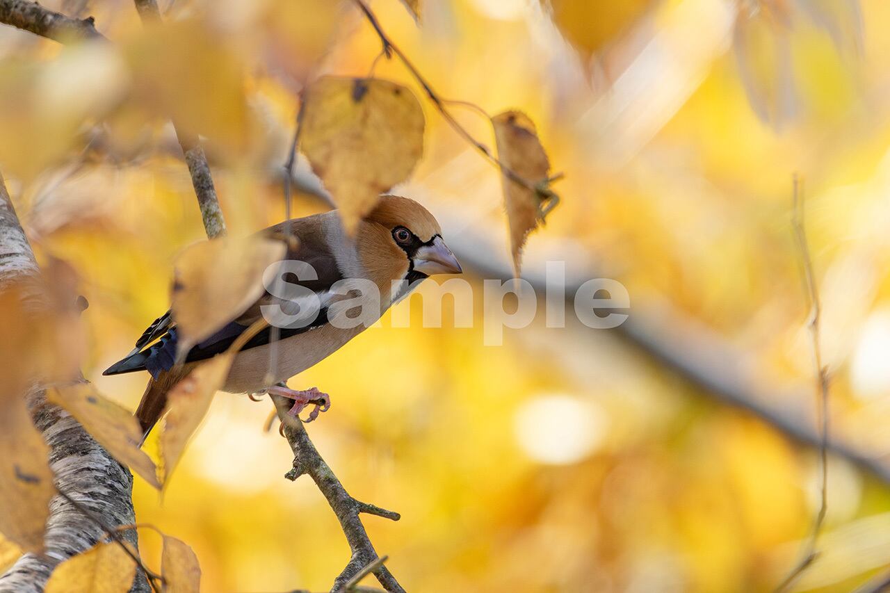 被写体:黄葉した白樺の枝に止まるオスのシメ