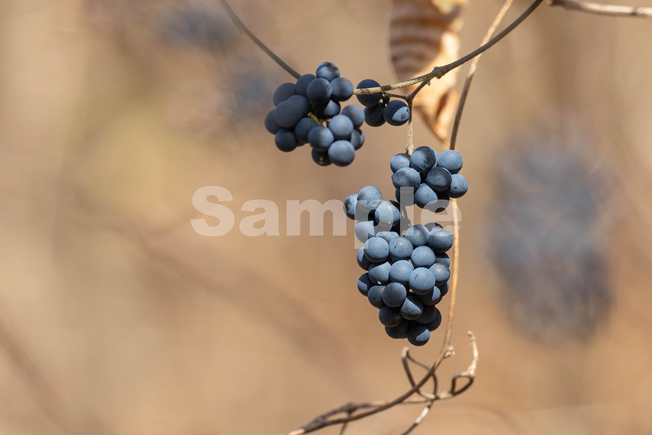 被写体:冬枯れた林道脇の陽だまりに垂れ下がるアオツヅラフジの実
