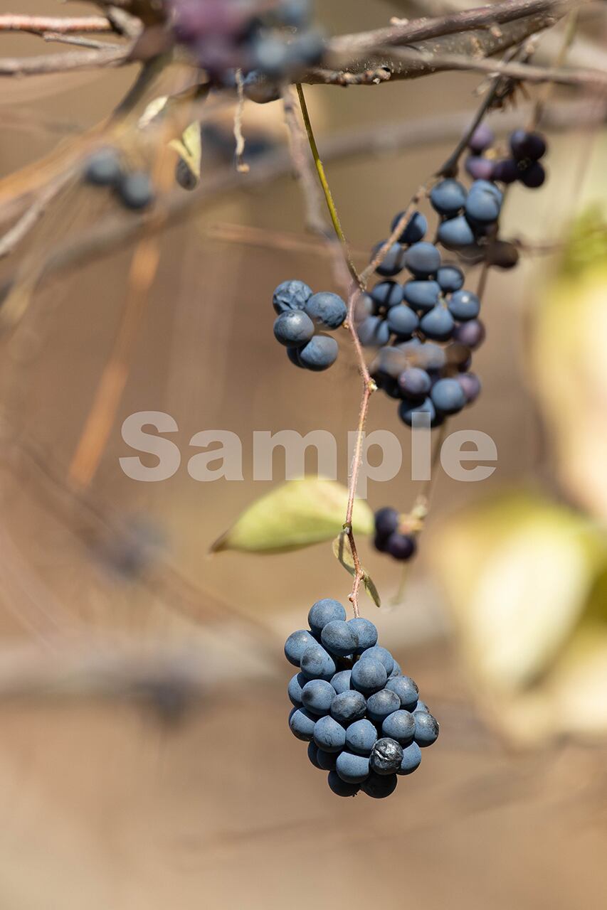 被写体:冬枯れた林道脇の陽だまりに垂れ下がるアオツヅラフジの実