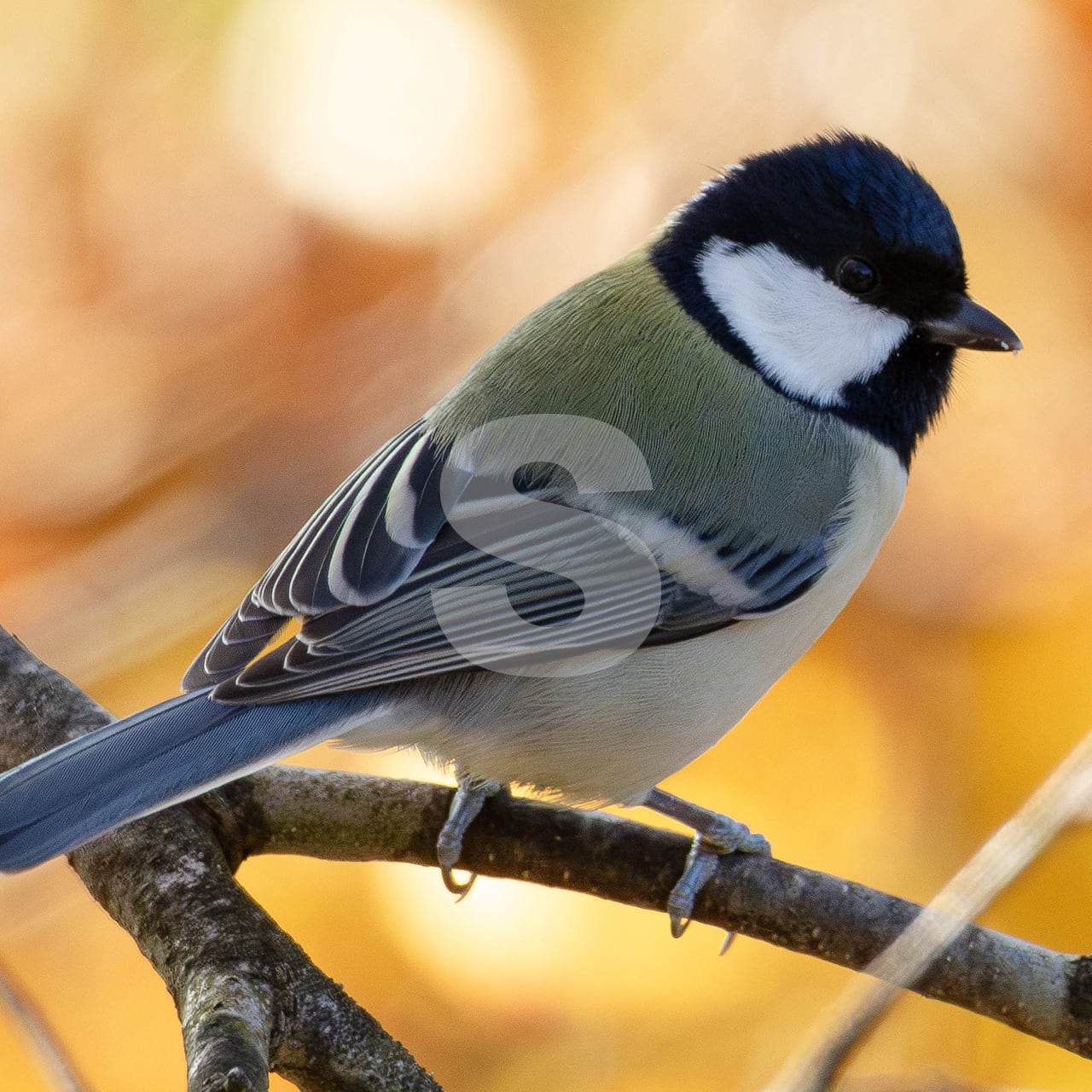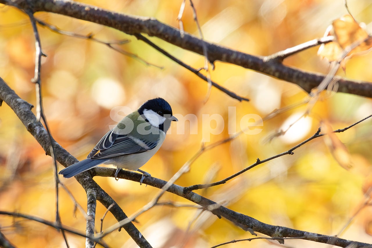 被写体:黄葉した林を背景に白樺の枝に止まるシジュウカラ