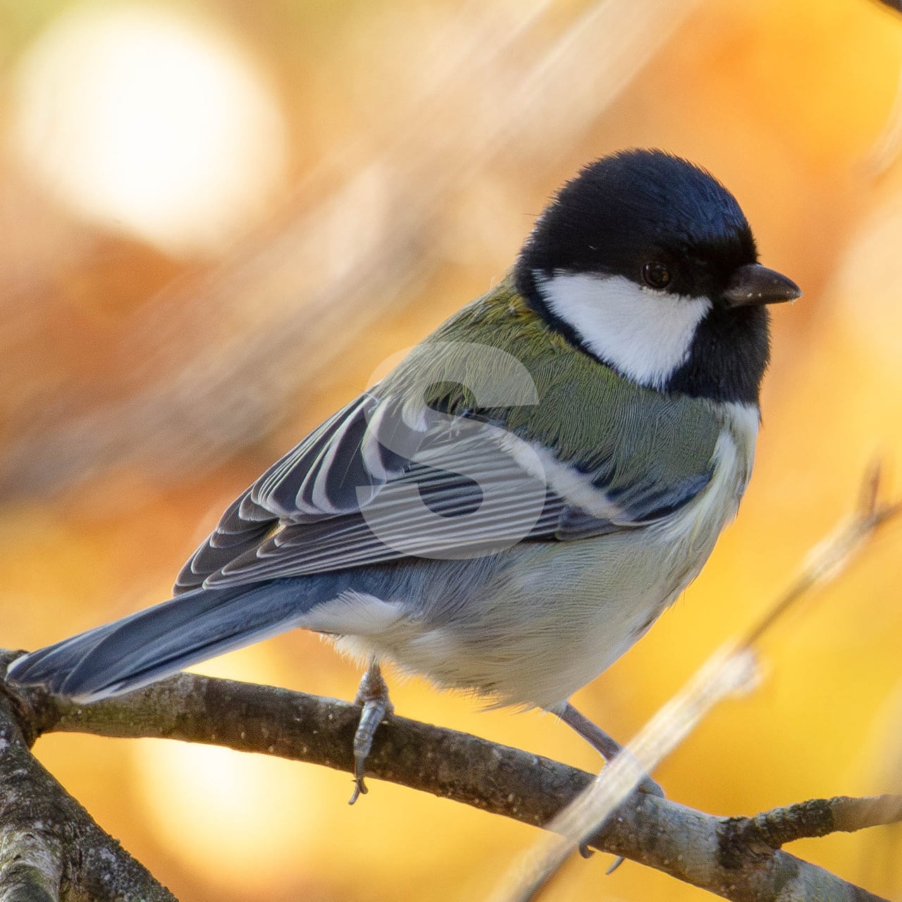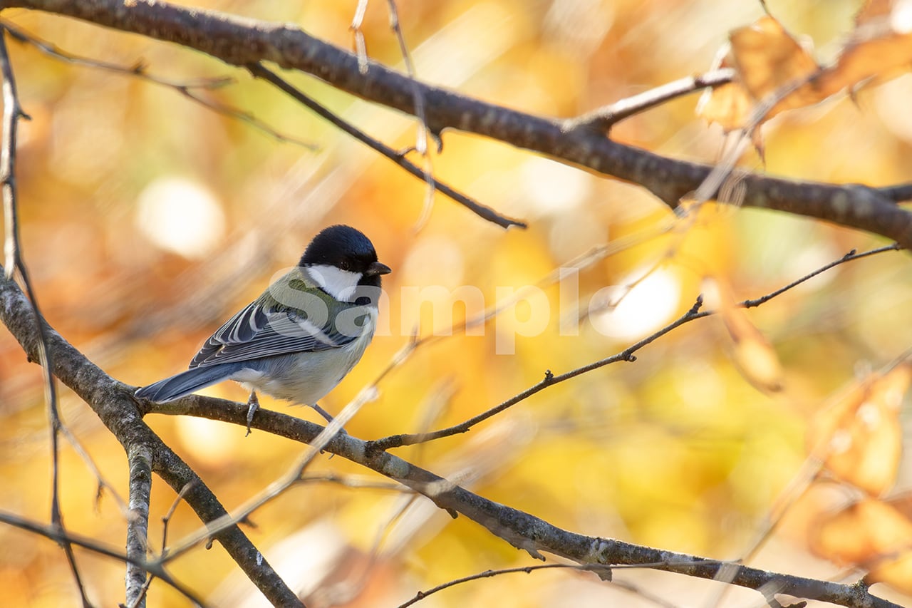 被写体:黄葉した林を背景に白樺の枝に止まるシジュウカラ