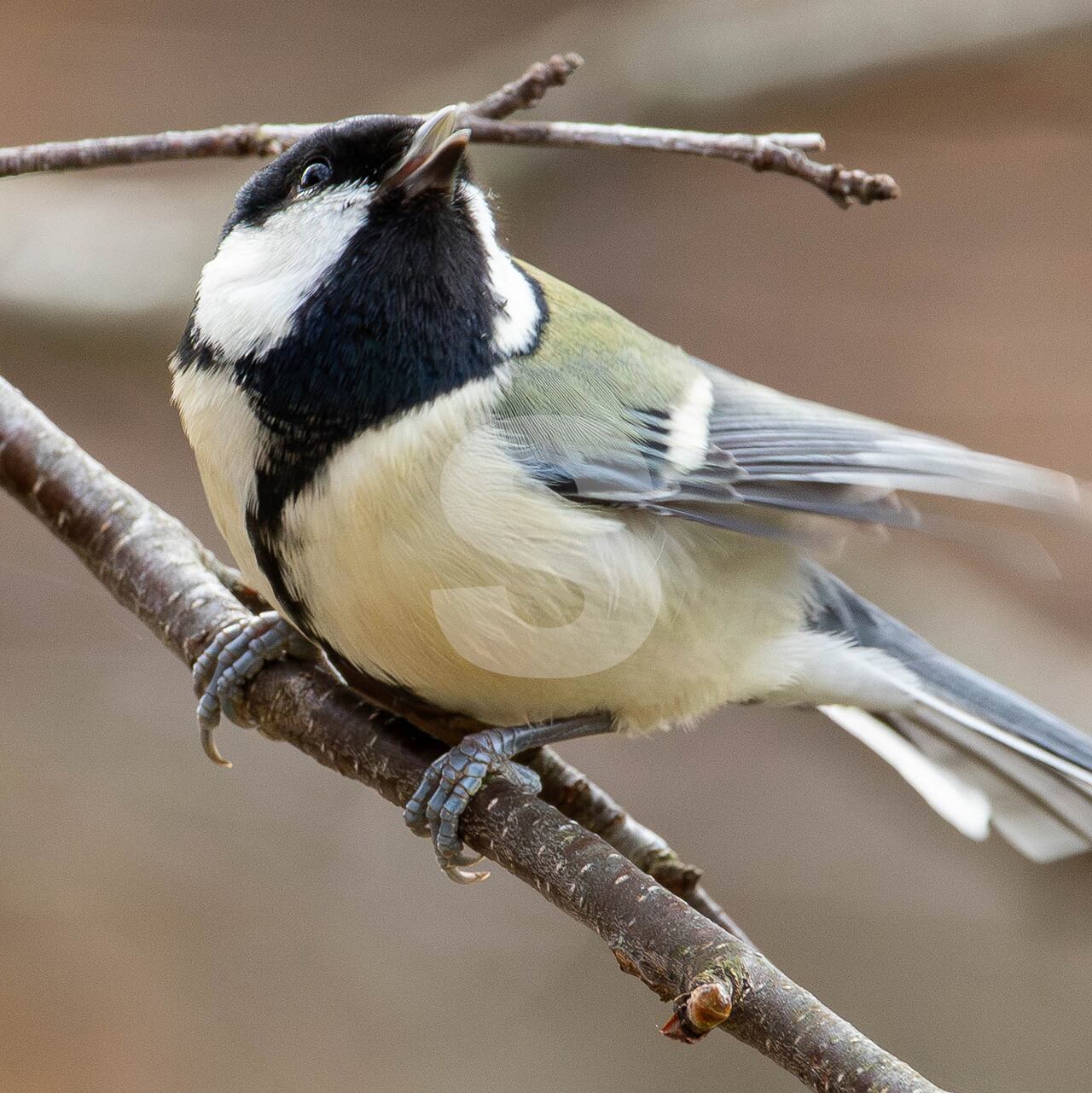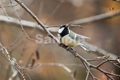 被写体:紅葉が終わりかけた林を背景に白樺の枝に止まるシジュウカラ