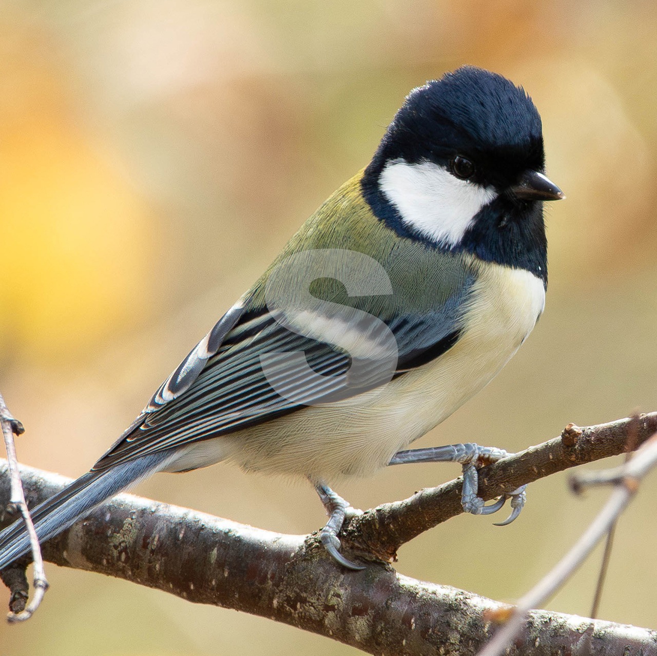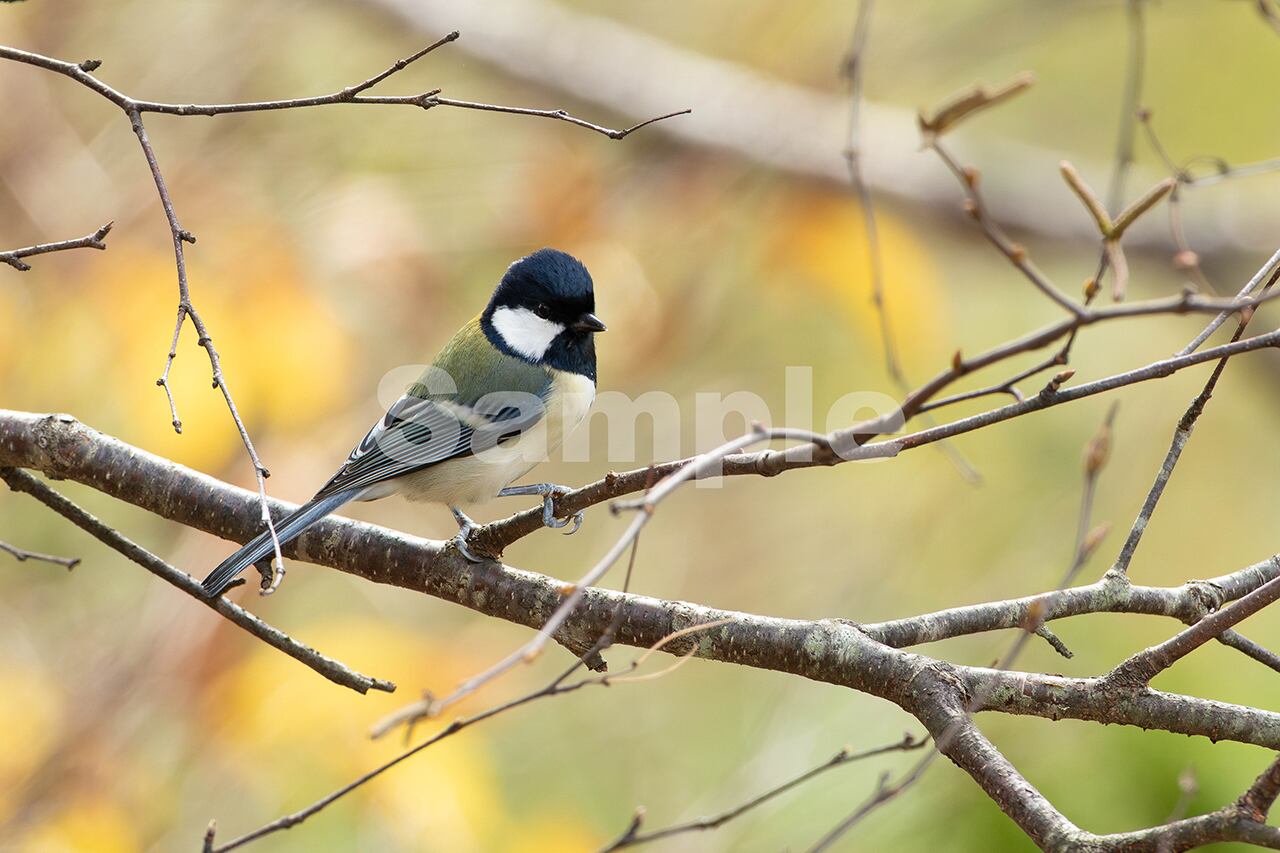 被写体:紅葉が終わりかけた林を背景に白樺の枝に止まるシジュウカラ