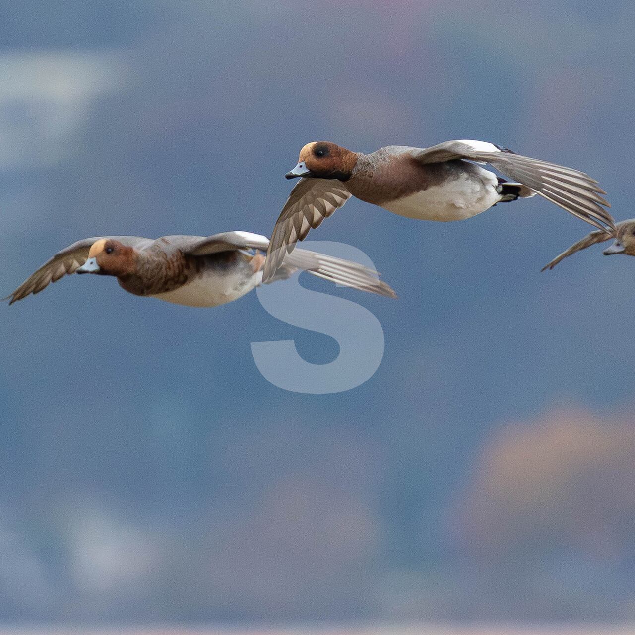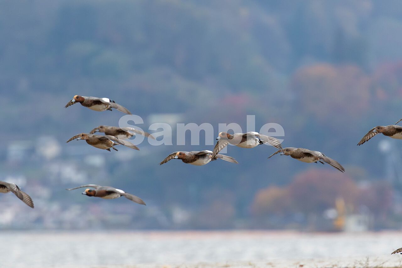 被写体:河口の浅瀬の上を飛ぶヒドリガモの群れ