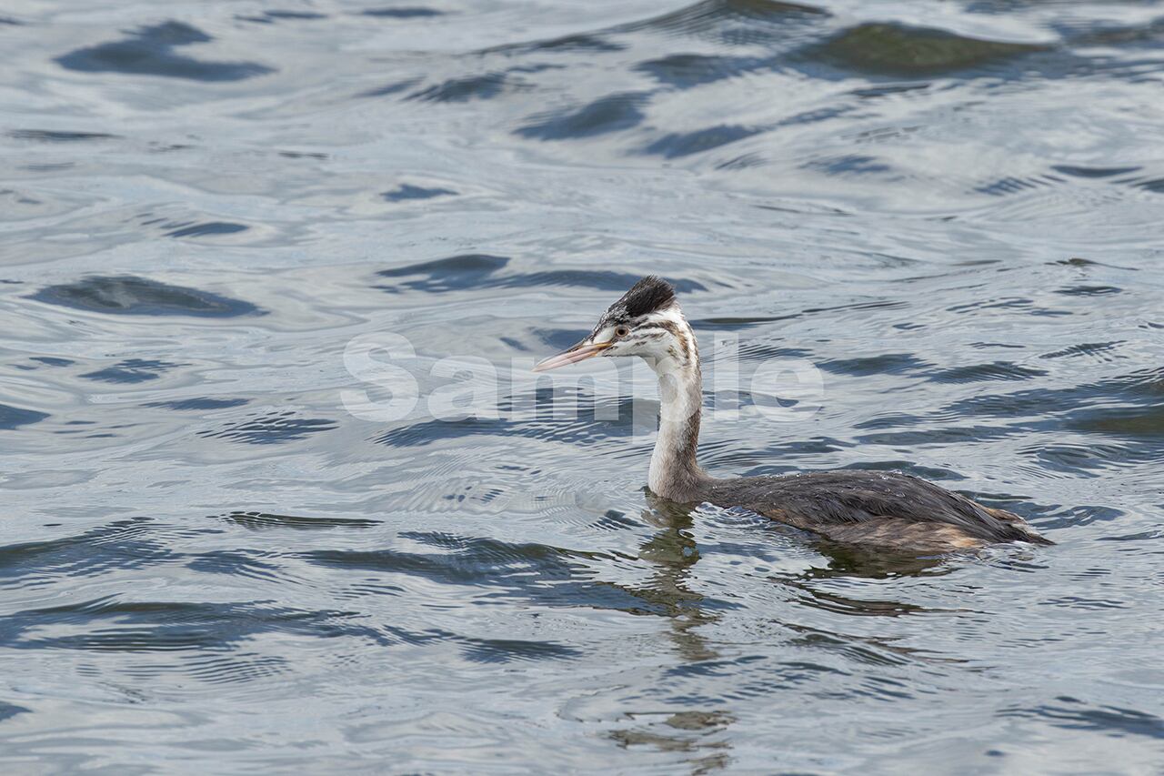 被写体:湖の岸近くを泳ぐカンムリカイツブリの幼鳥