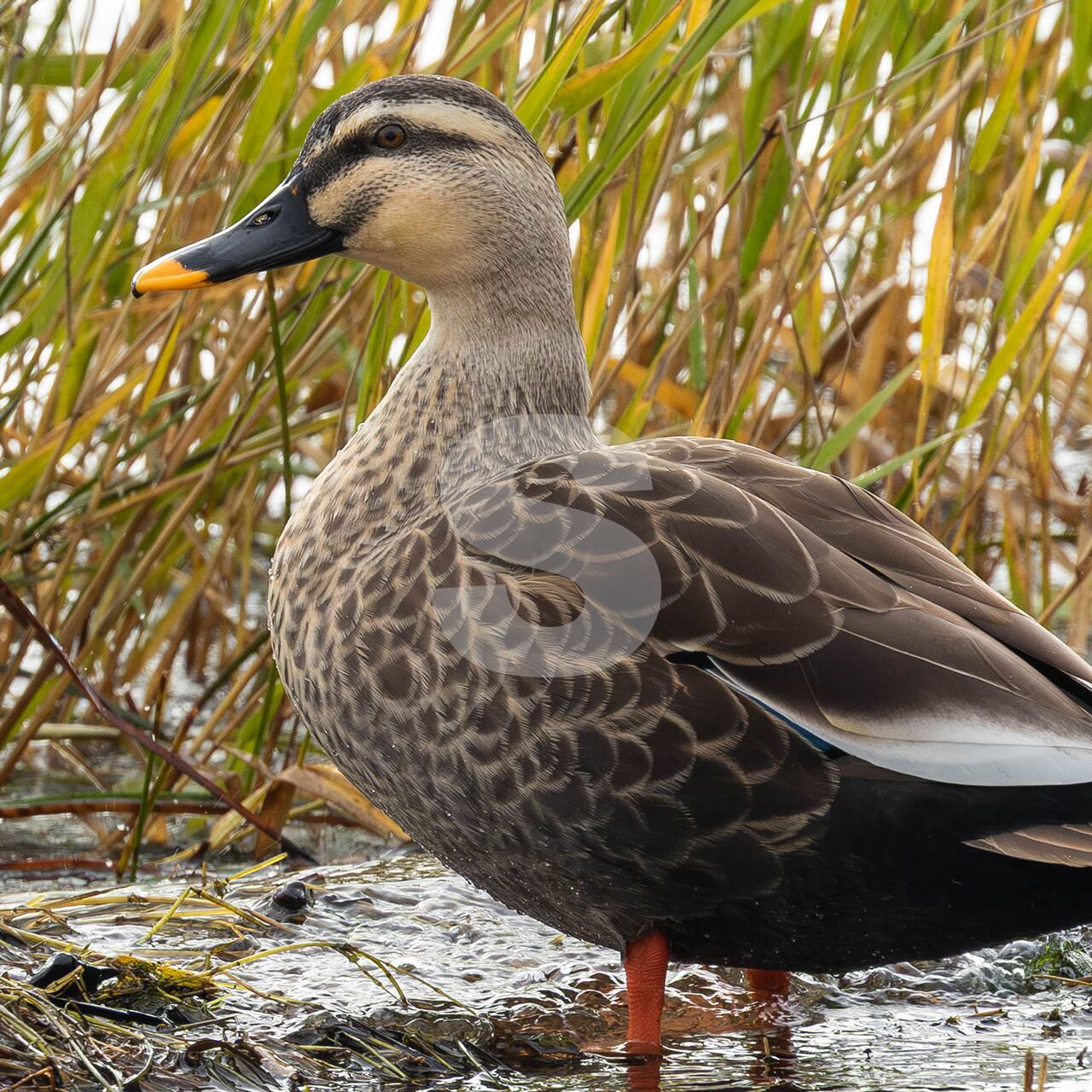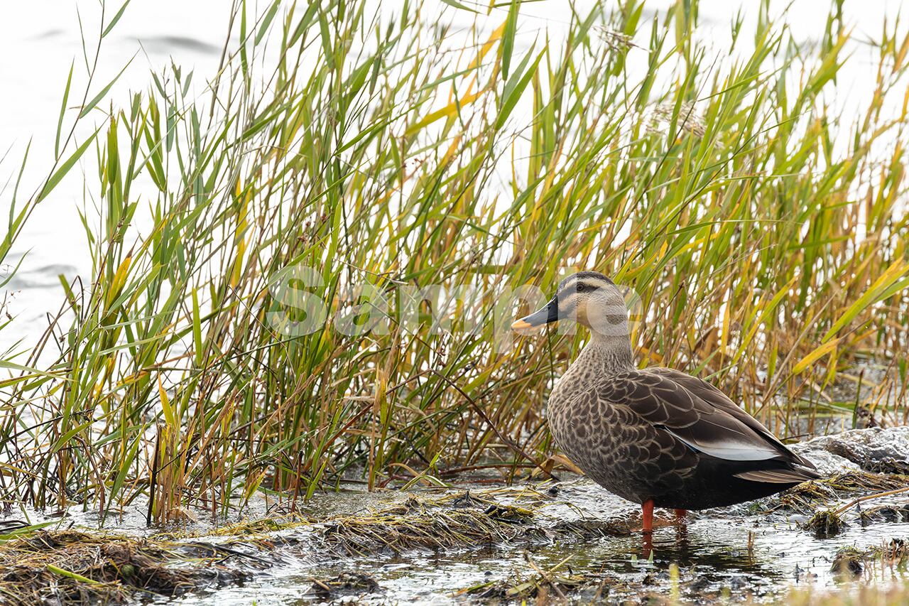 被写体:湖岸の葦の傍に佇むカルガモ