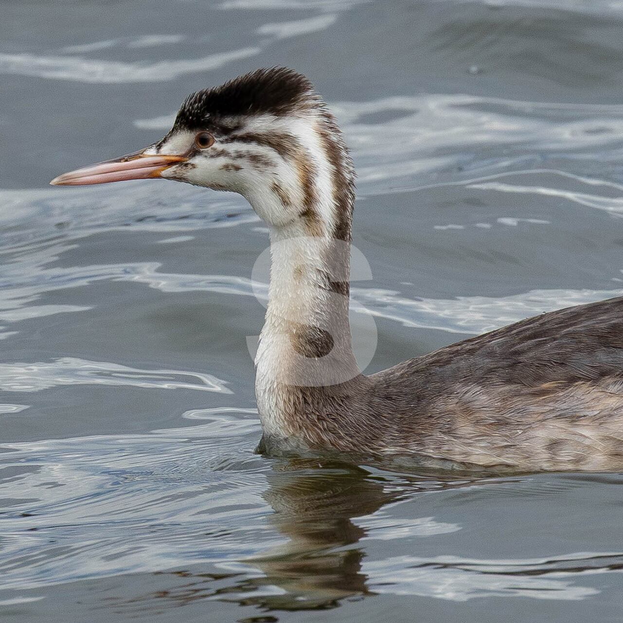 被写体:湖の岸近くを泳ぐカンムリカイツブリの幼鳥