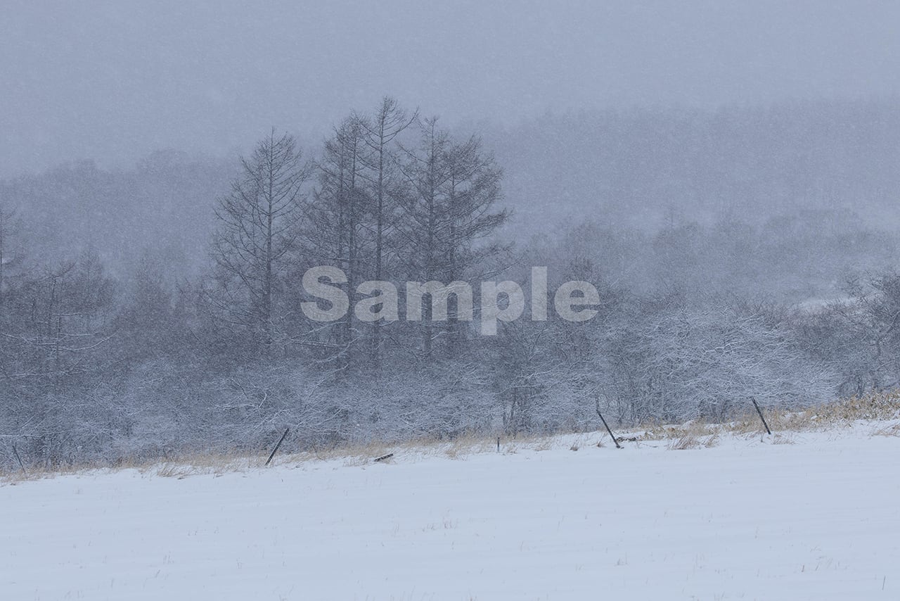 テーマ:風雪に覆われた牧草地と林縁のカラマツ