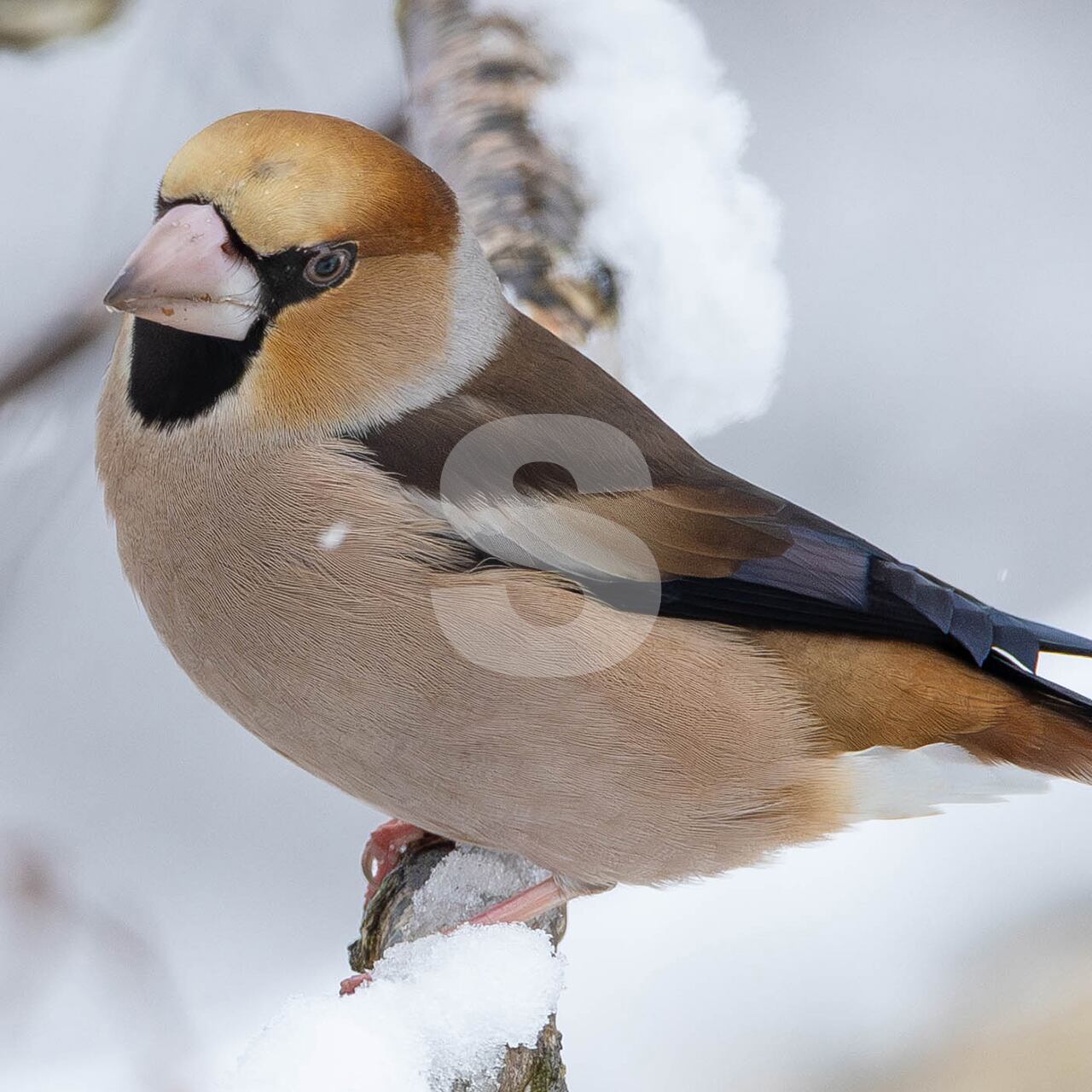 被写体:降雪のあった朝白樺の枝に止まるオスのシメ