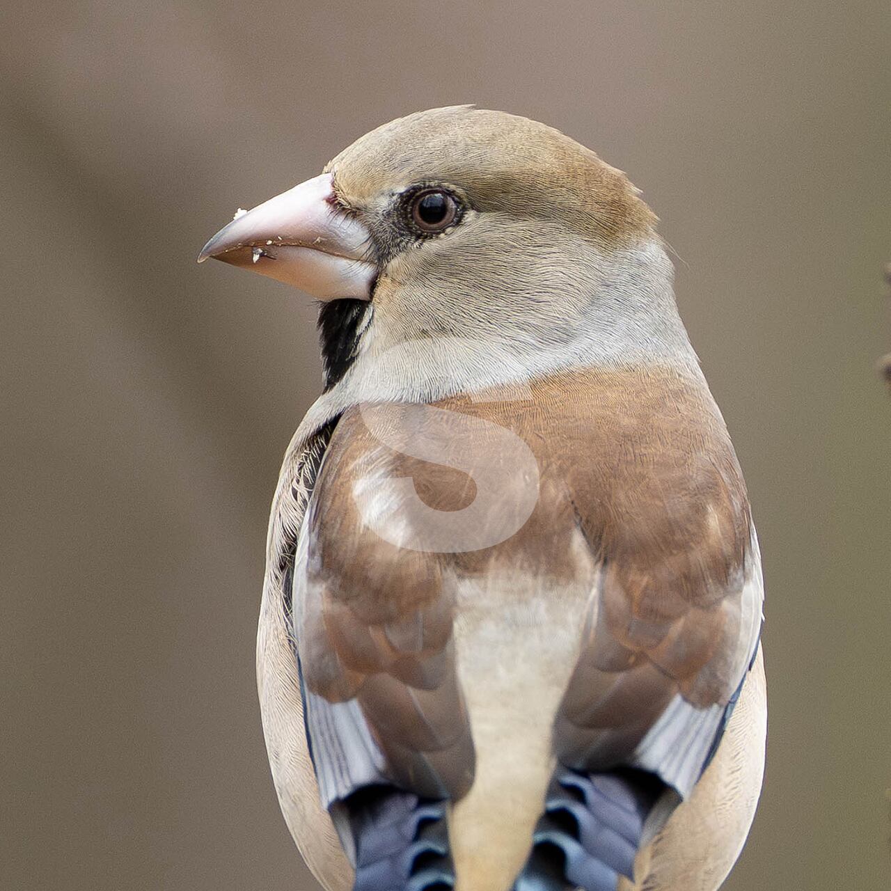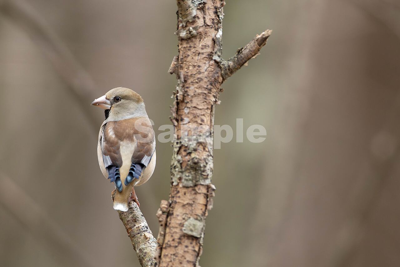 被写体:冬の森の枯れ枝に止まるメスのシメ
