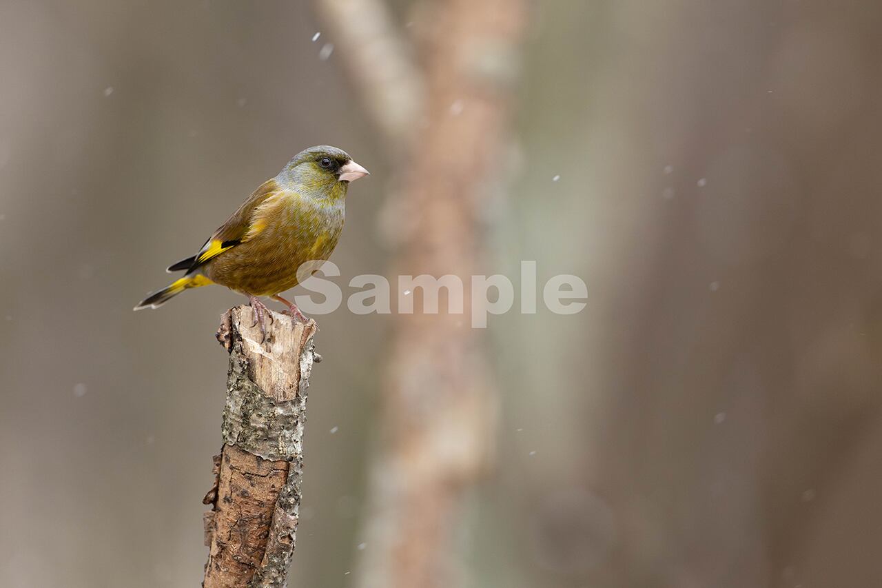 被写体:小雪の舞う森の枯れ枝に止まるオスのカワラヒワ