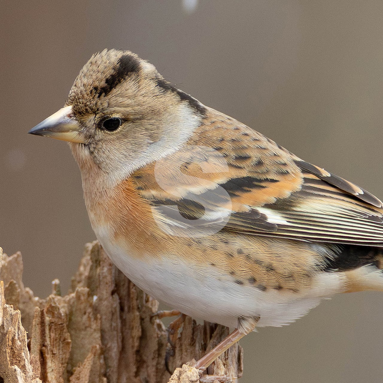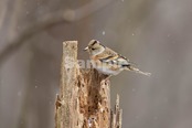 被写体:冬の森の朽木に止まるアトリのメス