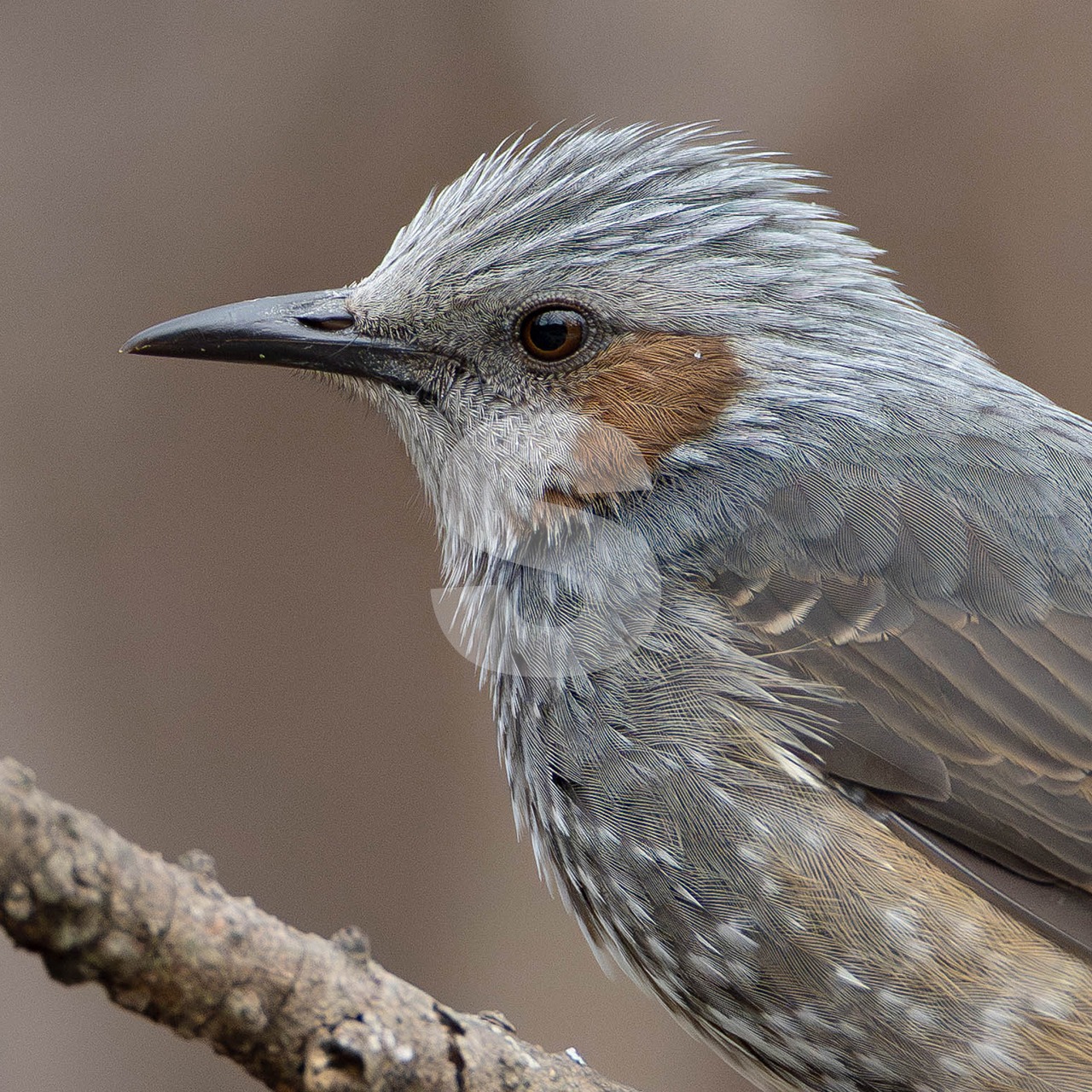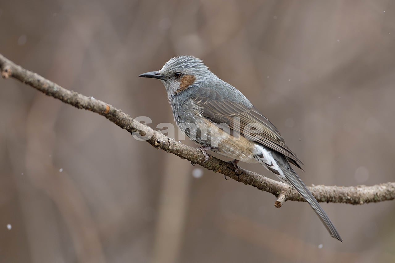 被写体:小雪の舞う冬の森の枯れ枝に止まるヒヨドリ