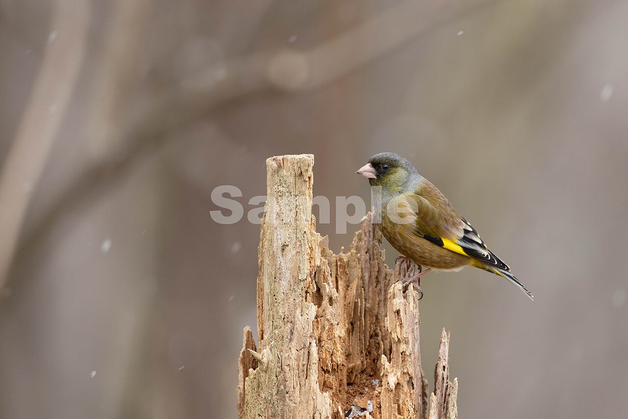 被写体:冬の森の朽木に止まるオスのカワラヒワ