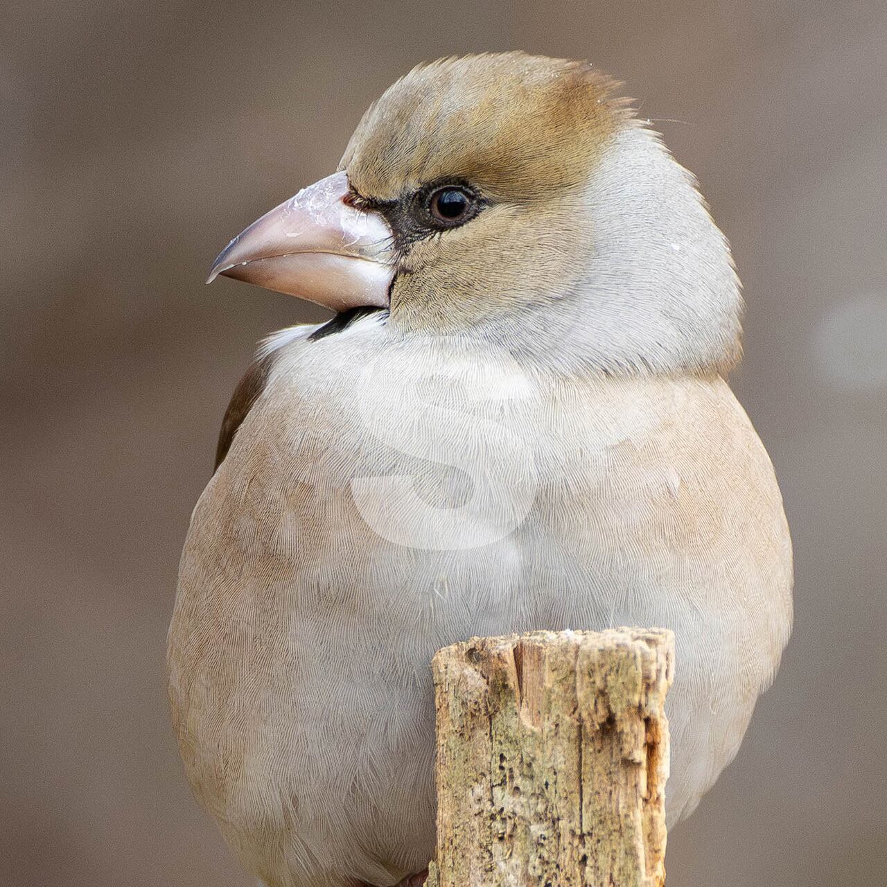 被写体:冬の森の朽木に止まったメスのシメ