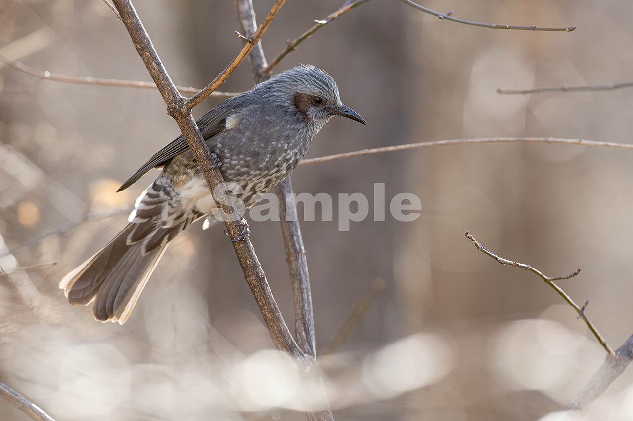 被写体:木漏れ日が輝く枯れ色の森のマユミの枝に止まるヒヨドリ