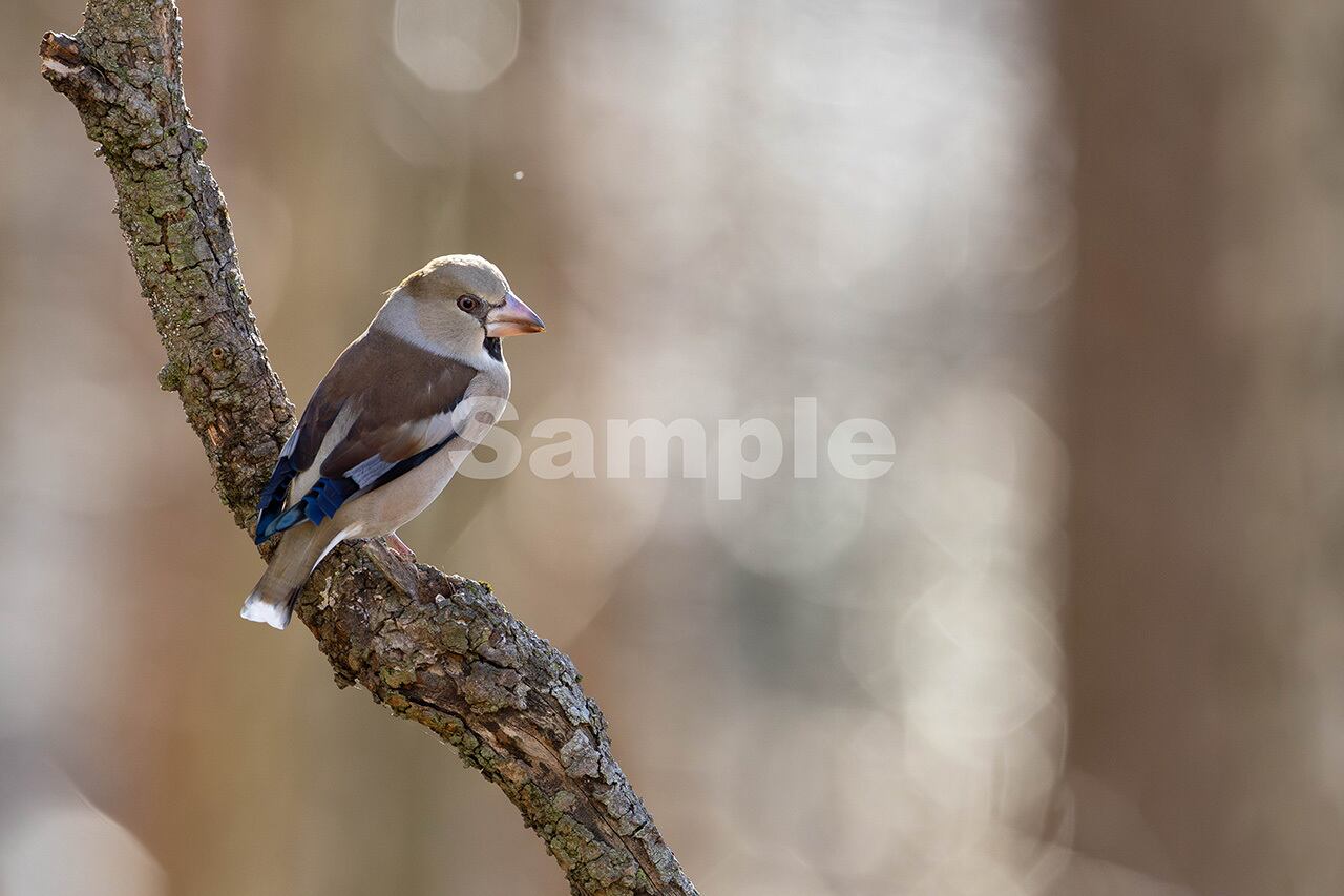 被写体:木漏れ日が輝く枯れ色の森の朽木に止まるメスのシメ