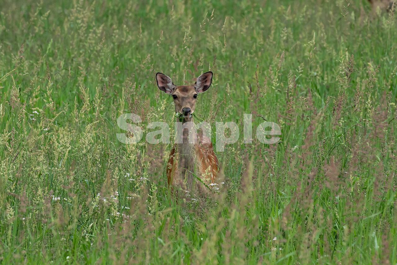 被写体:牧草の繁茂した草原でクローバーを喰むニホンジカの子供(鹿)