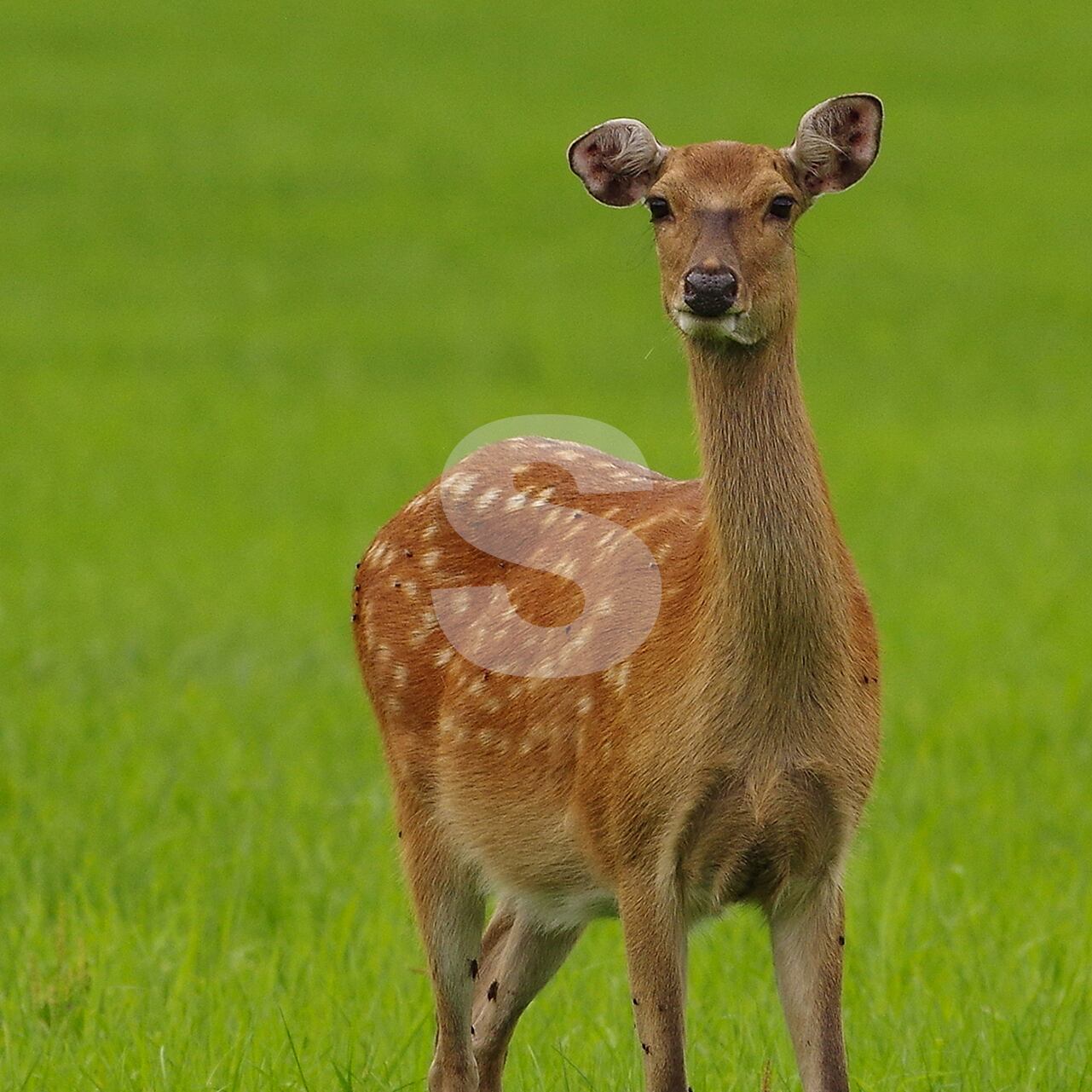 被写体:エメラルドグリーンの牧草地に佇む一頭のニホンジカ(鹿)