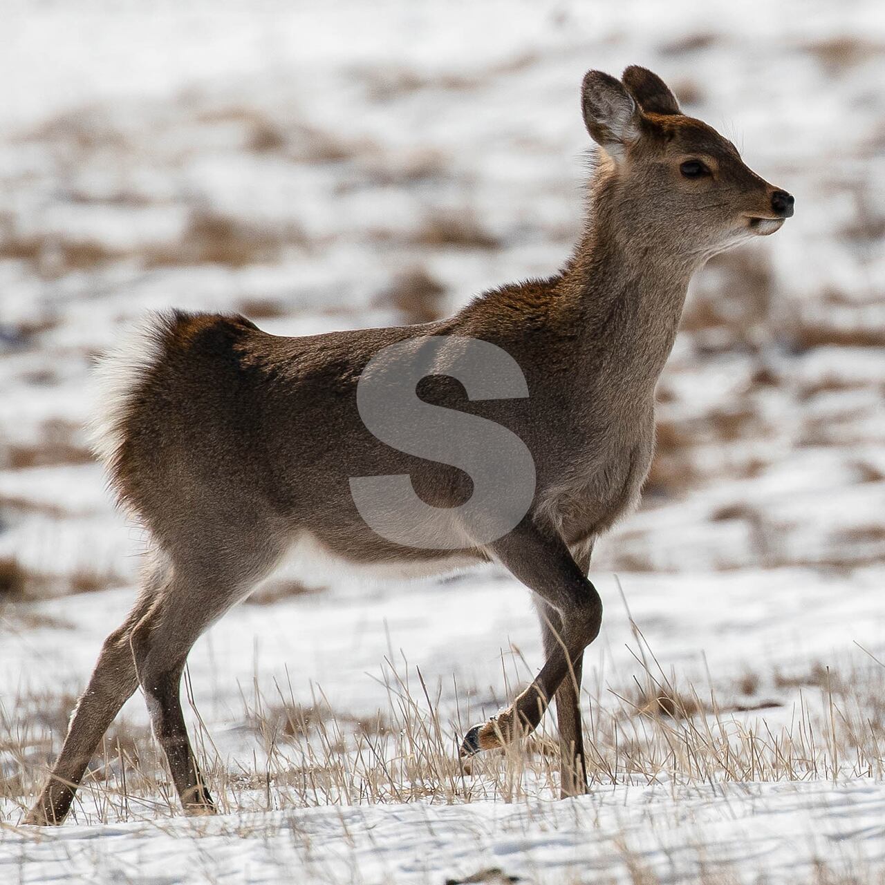 被写体:雪に覆われた放牧地を横切るニホンジカ(鹿)