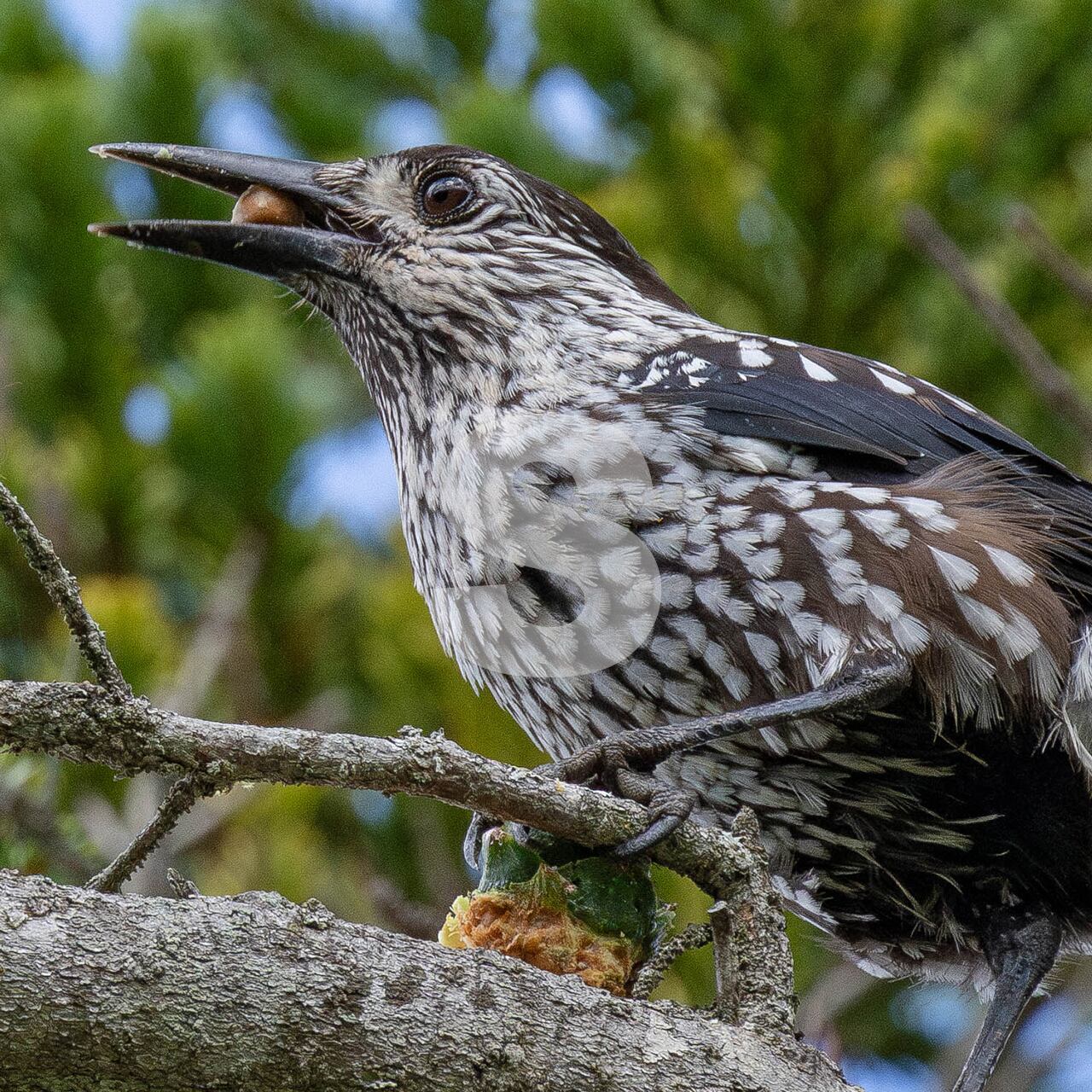 被写体:オオシラビソの老木の枝でゴヨウマツの実を啄むホシガラス