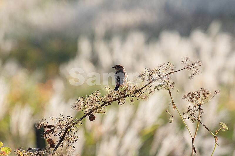 被写体:草紅葉の草原でウドの実に止まるノビタキ(メス)