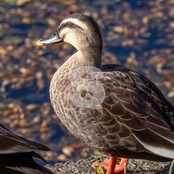 被写体:ヒシが繁茂した遊水池の護岸の上で休むカルガモ