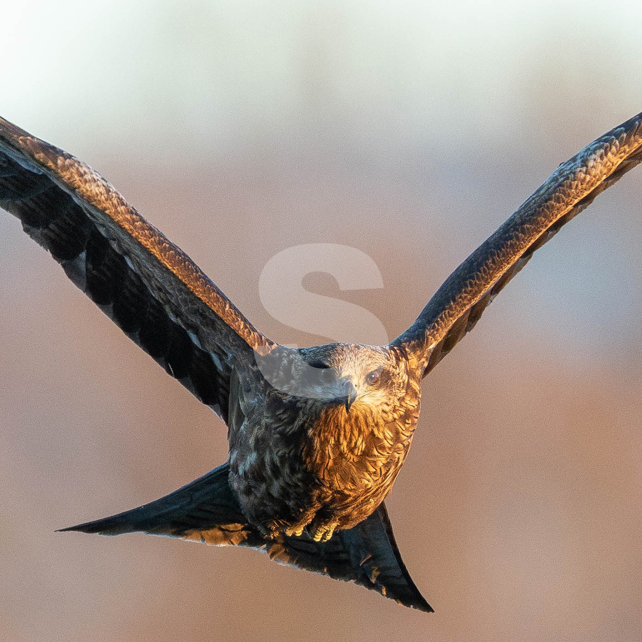 被写体:遊水池の上空を飛翔する西日に照らされたトビ