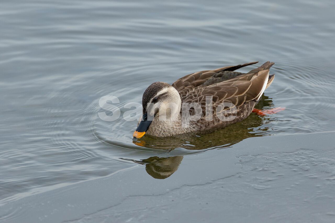 被写体:湖岸近くで採餌するカルガモ(諏訪湖)