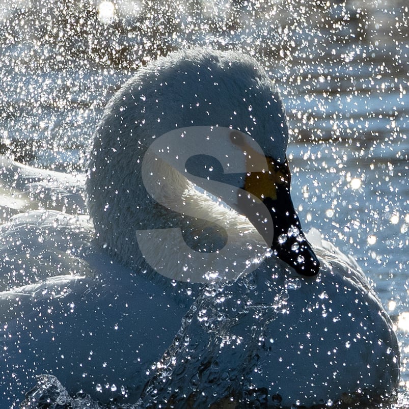 被写体:越冬地の浅瀬で水浴びするコハクチョウ