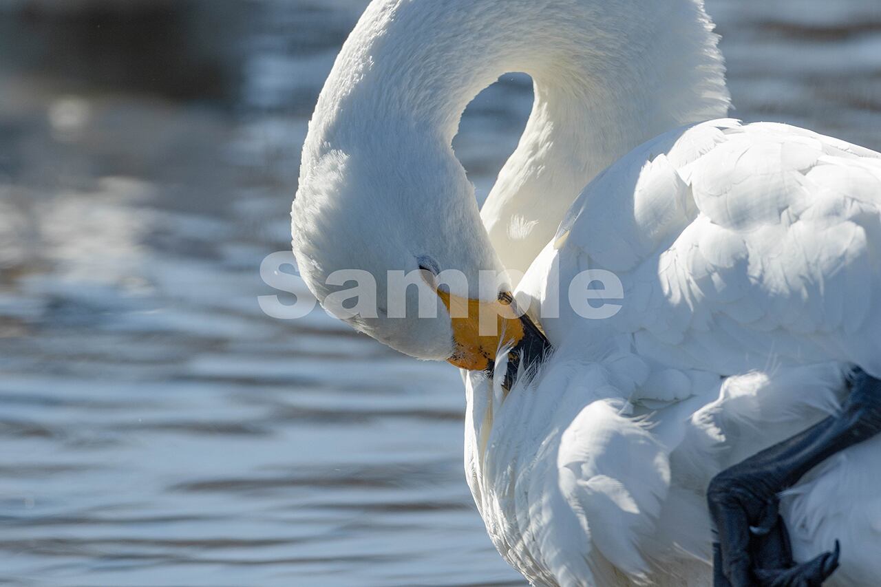 被写体:越冬地の浅瀬で羽繕いするコハクチョウ