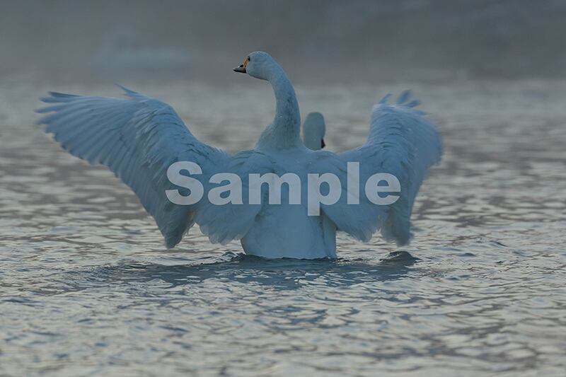 被写体:早朝の川霧の中で羽ばたくコハクチョウ