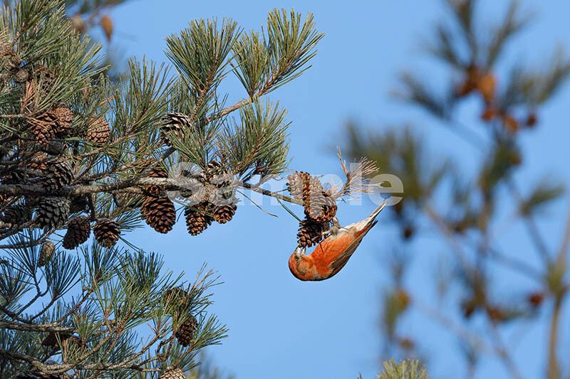 被写体:松笠の実を啄むイスカのオス