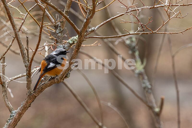 被写体:芽吹き前のベリーの枝に止まるジョウビタキ(オス)