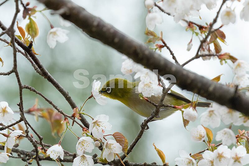 被写体:ヤマザクラの花で吸蜜するメジロ