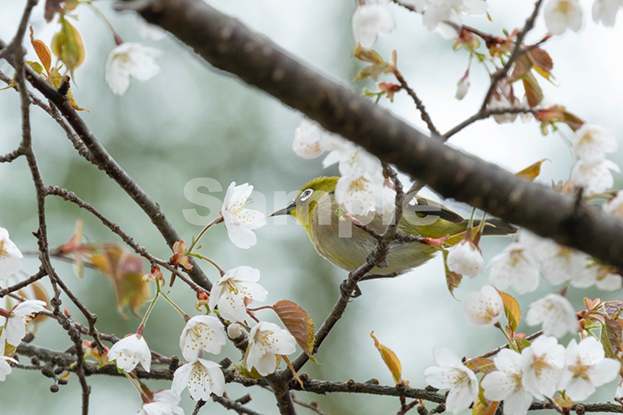 被写体:ヤマザクラの花で吸蜜するメジロ