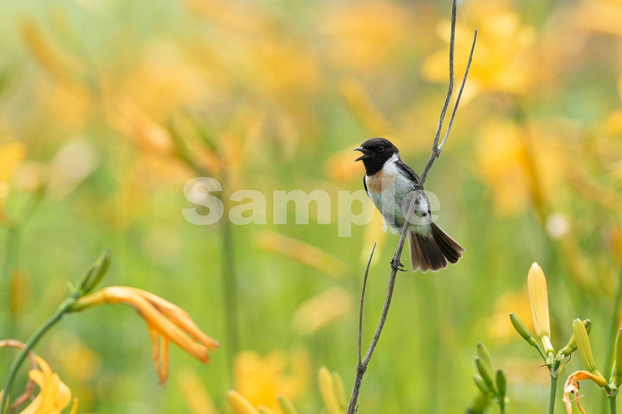 被写体:ニッコウキスゲの咲き誇る草原で威嚇の鳴き声をあげるオスのノビタキ