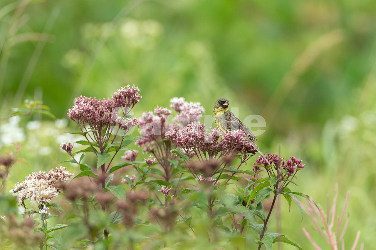 被写体:花期も終盤のヒヨドリバナの上で辺りを伺うアオジ
