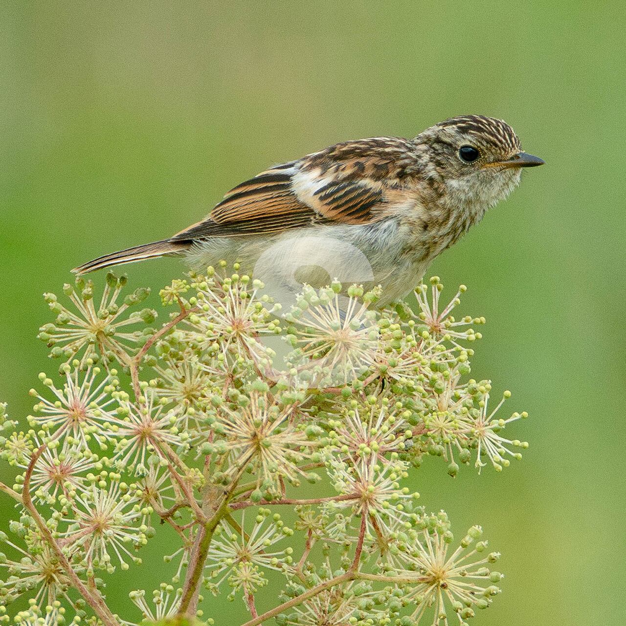 被写体:ウドの花の上に止まるノビタキの幼鳥
