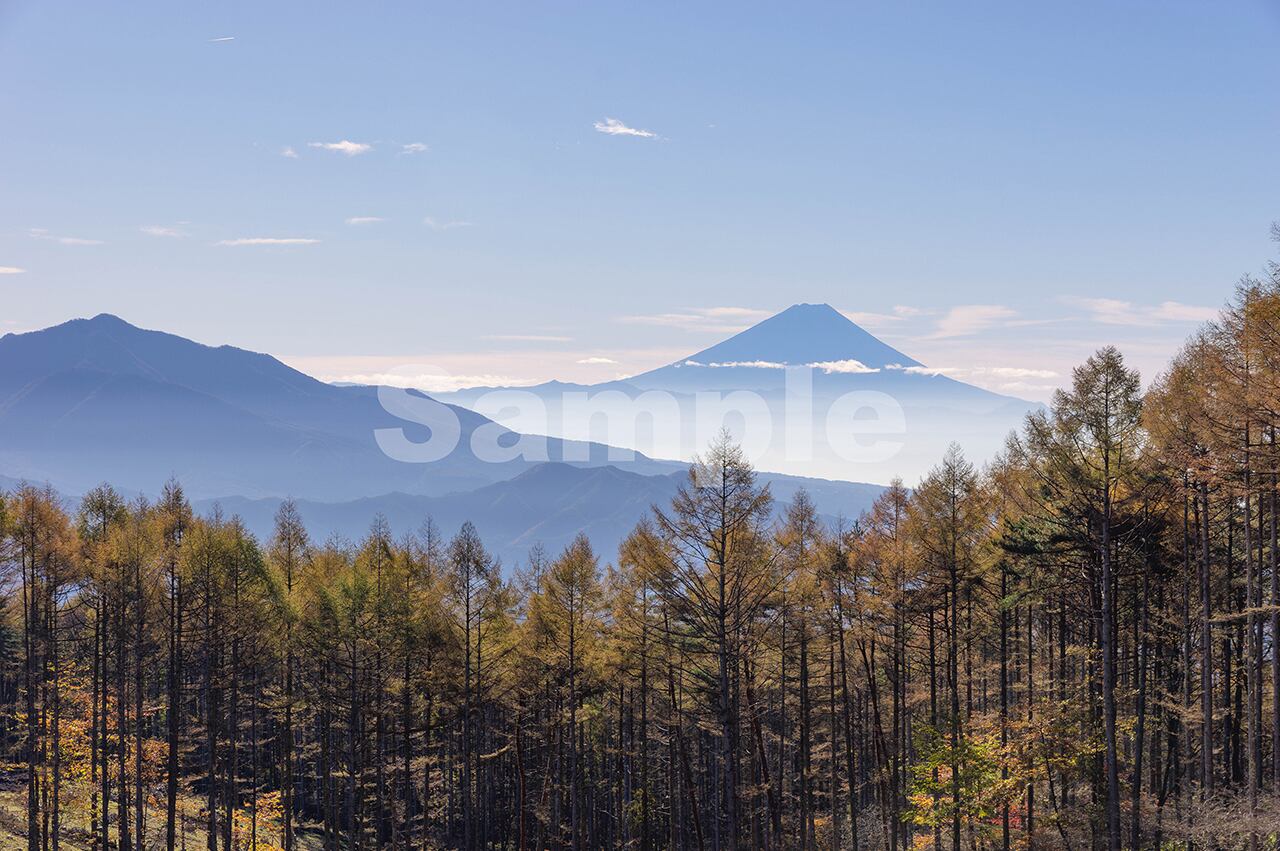テーマ:黄葉が始まったカラマツ林越しに望む朝靄たなびく富士山