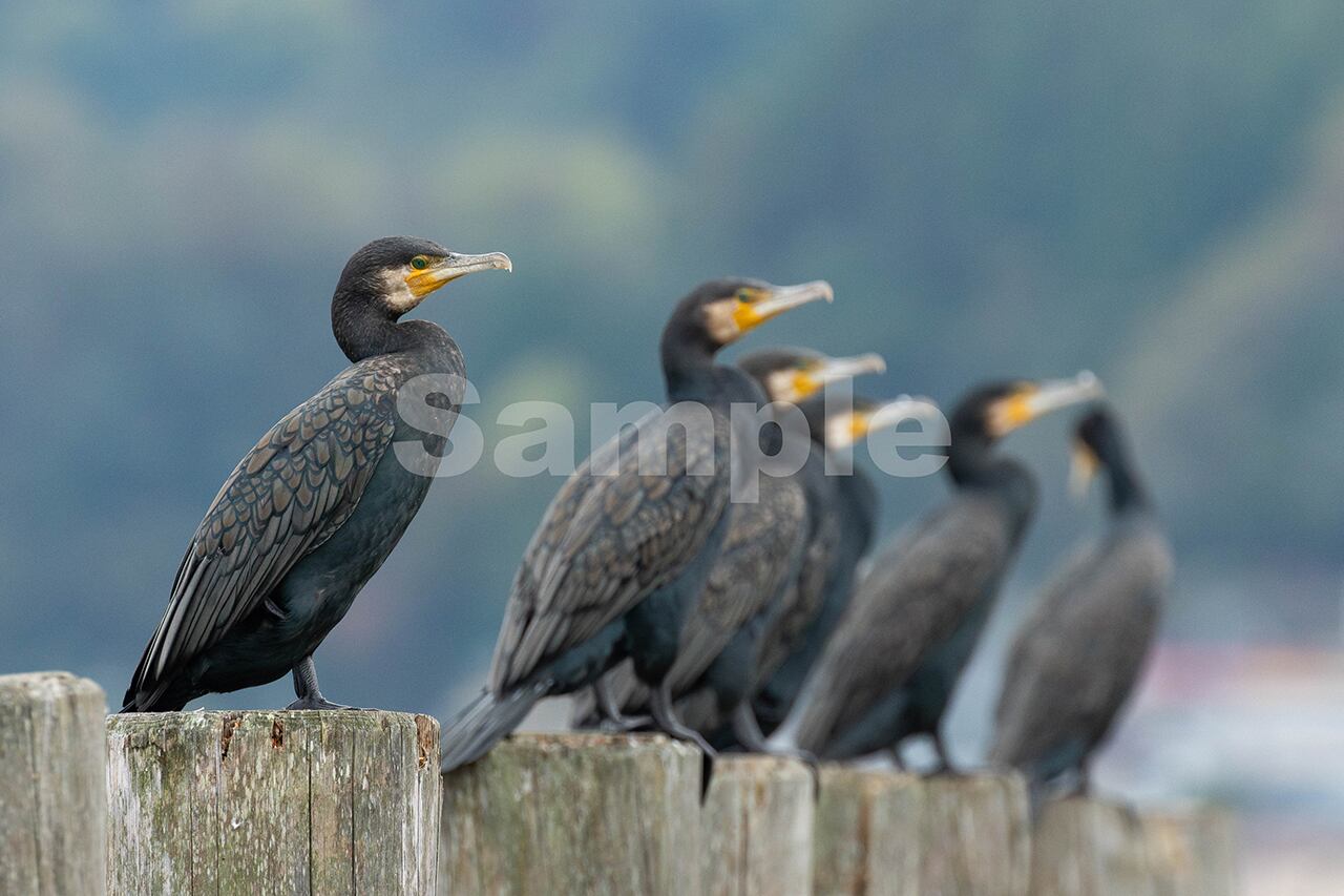 被写体:古びた桟橋の支柱に並ぶカワウの群れ